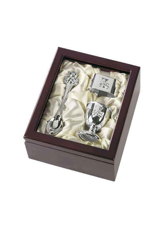 This Egg Cup, Spoon & Napkin Ring Set Boxed in Brown/Silver is a perfect gift for Christenings. Shop now at Concord Trophies!